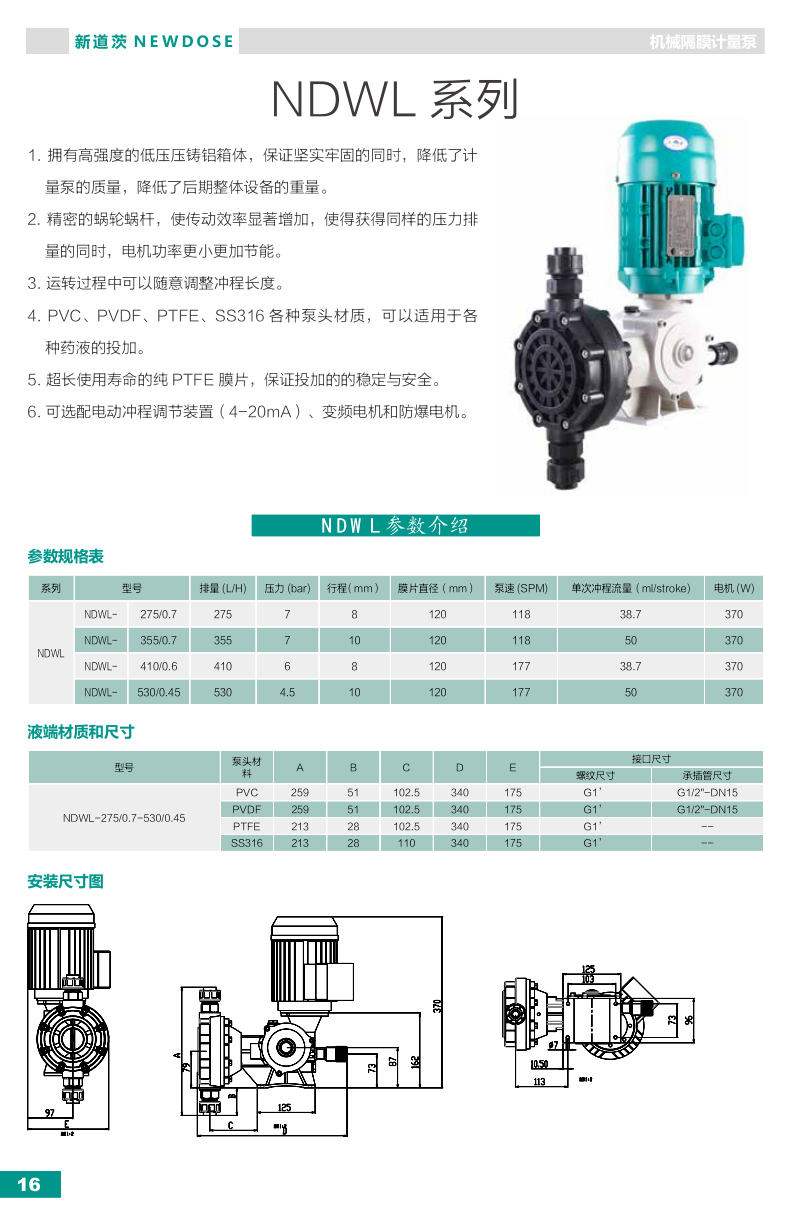 新道茨 ND 型计量泵是一种用来输送腐蚀性和非腐蚀性液体的一种特殊容积泵。计量泵也称定量泵或比例泵,属于往复式容积泵,流量可以在 0~100% 范围内无级调节,用于精确计量投加液体,其稳定性精度不超过 ±1%。随着现代化工业不断向自动化操作、远程自动化控制方向的发展,计量泵的配套性强、适应介质(液体)广泛的功能显得尤为重要。ND 型计量泵的结构设计,充分考虑了不同的工作环境,广泛应用于石油化工业、天然气开采、炼油、热电厂、工矿(锅炉)、食品、制药、科研、印染、造纸等环保水处理工业等。